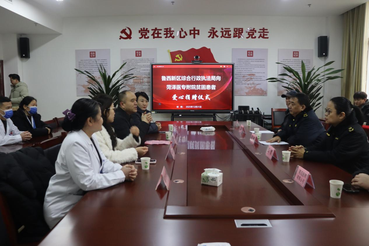 2025年12月31日上午,鲁西新区综合行政执法局向菏泽医专附属医院贫困患者的爱心捐赠仪式在医院会议室举行。鲁西新区综合行政执法局代表、医院领导及相关负责人、爱心企业代表齐聚现场,共同见证温暖时刻。