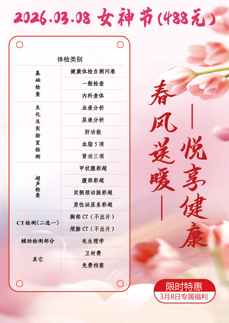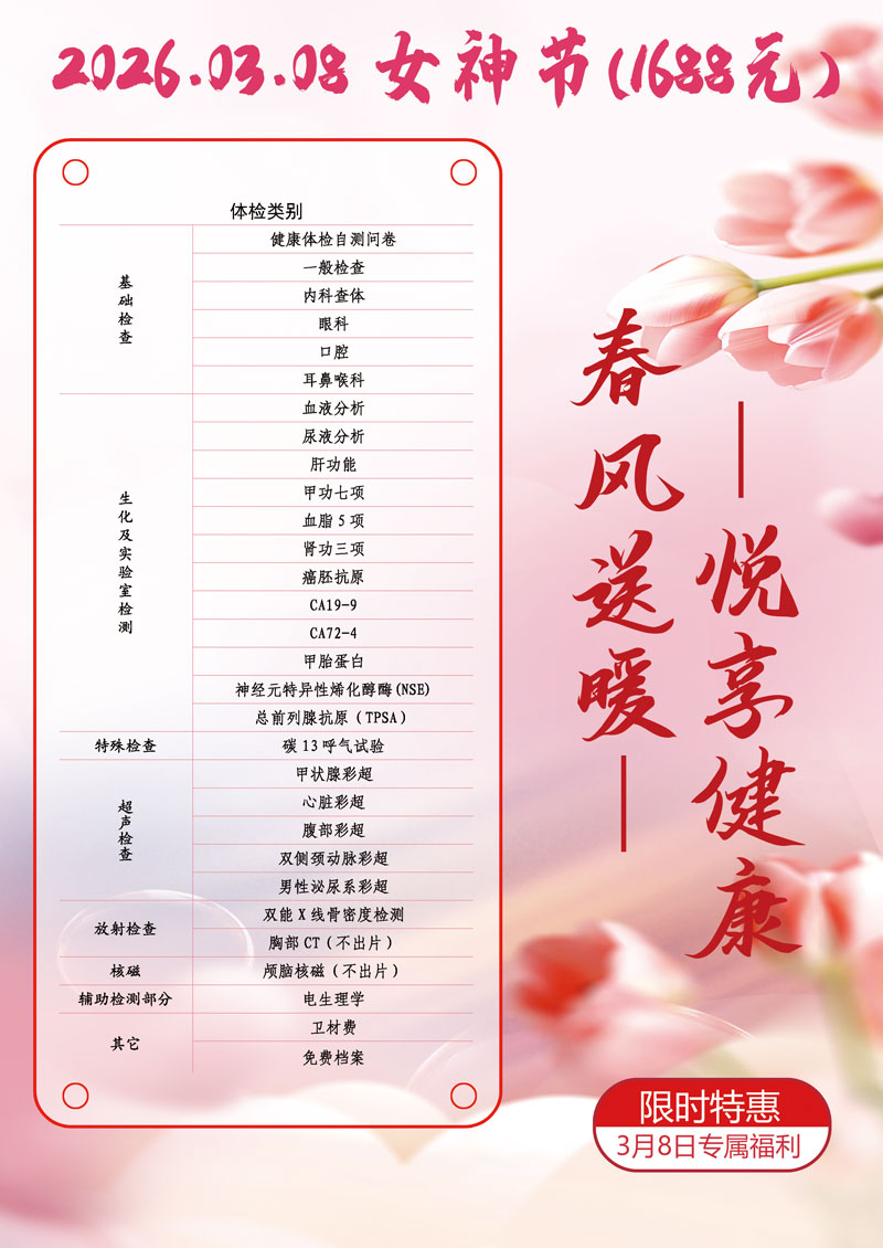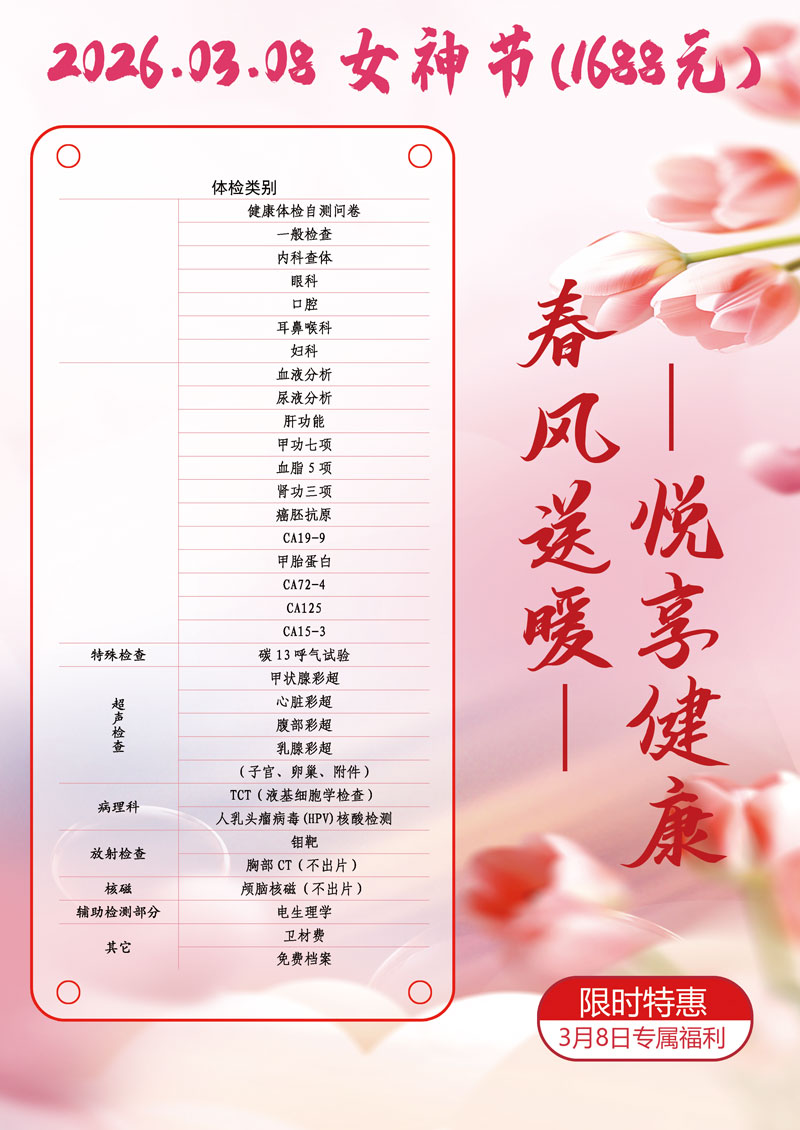 春风送暖,悦享健康!2026“三八”国际妇女节,健康体检科暖心推出女神专属分级体检优惠套餐,同步上线伴侣同行特惠套餐,分档定制、按需选择,以专业筛查与贴心福利,守护女性健康,礼遇家庭相伴!