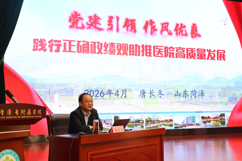 唐长冬教授围绕《党建引领 作风优良—践行正确政绩观,助推医院高质量发展》这一当前政治任务,进行了专题授课。唐教授从坚持党建引领、践行正确政绩观,坚持党委领导下院长负责制,坚持行风助推医院精细化管理三个方面,阐述了党建引领作风建设的重要意义及工作重点。