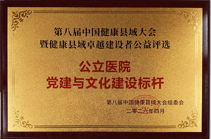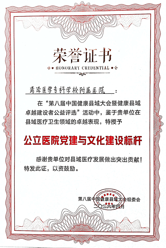 2026年4月24—26日,第八届中国健康县域大会暨健康县域卓越建设者公益评选活动在合肥,菏泽医专附属医院被评选为“公立医院党建与文化建设标杆”。
